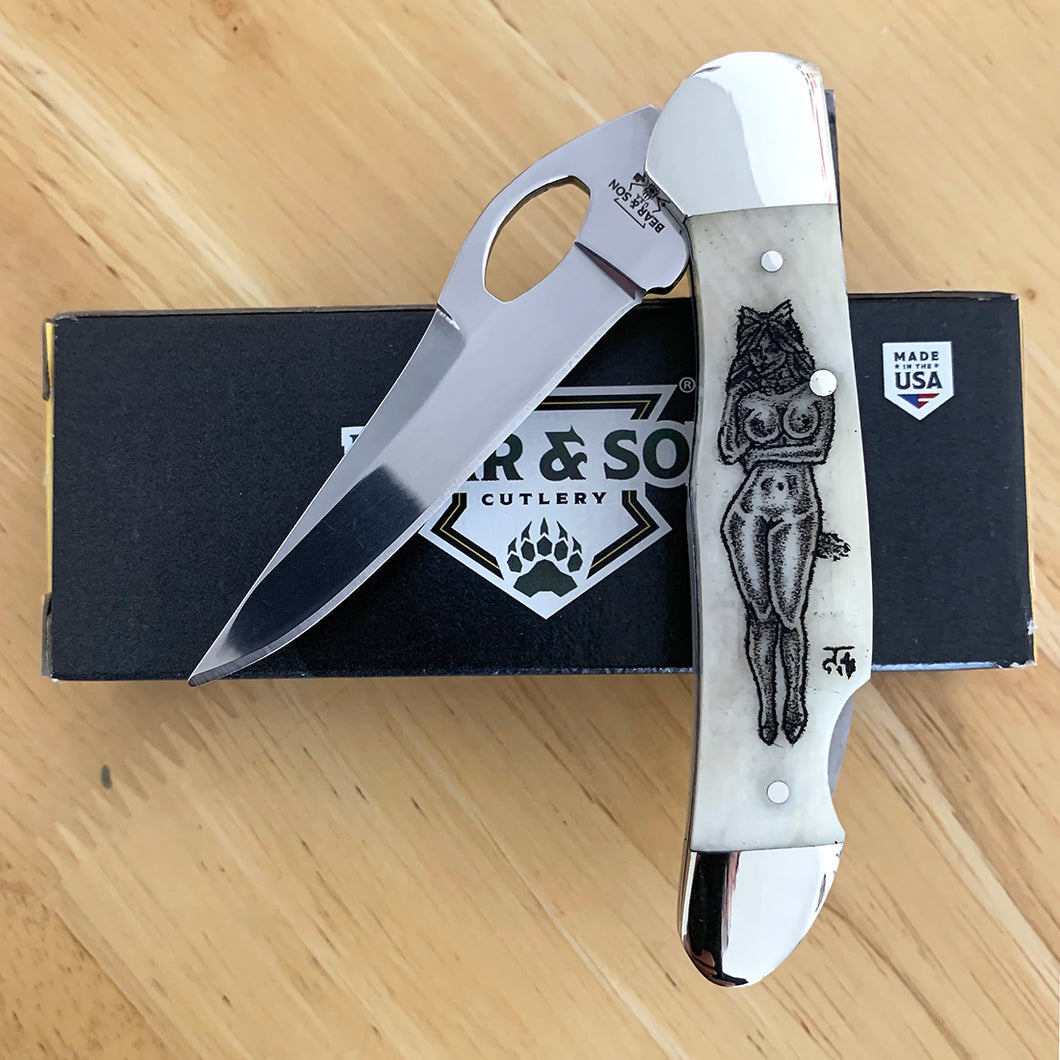 I am a self taught artist specializing in ink and watercolor tattoo styled pinups and scrimshaw (hand engraving) on bone handled knives. I sell original pieces, merchandise and am also available for custom commissions. Enjoy 🙏🏻