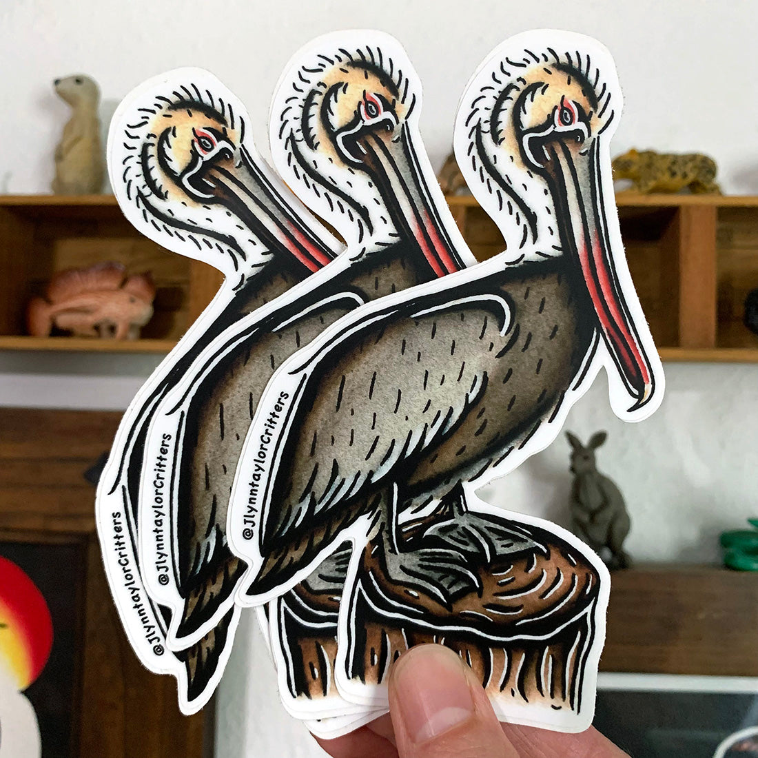 Brown Pelican die cut sticker on thick matte vinyl. Weather and scratch proof lasting up to 5 years outdoors. Approximately 3x5 inches. Original ink and watercolor artwork by Jlynntaylor.