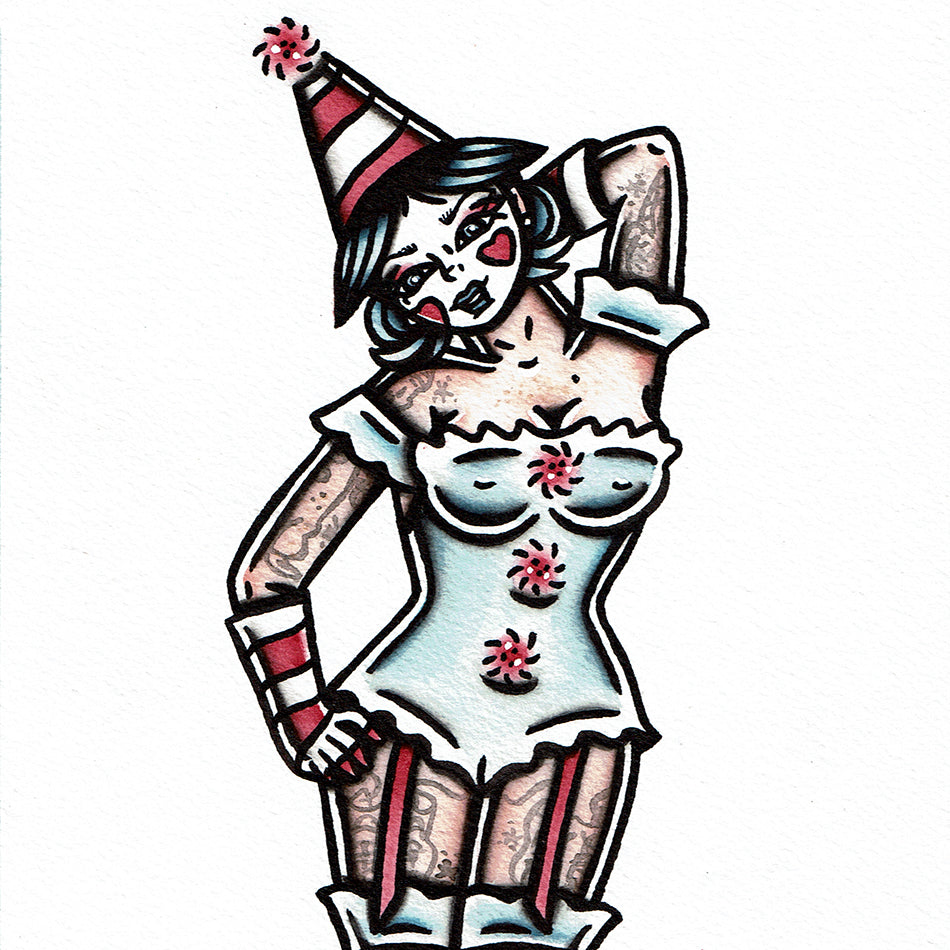 American traditional tattoo flash Clown Pinup watercolor painting.