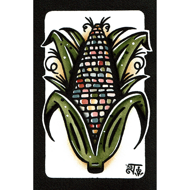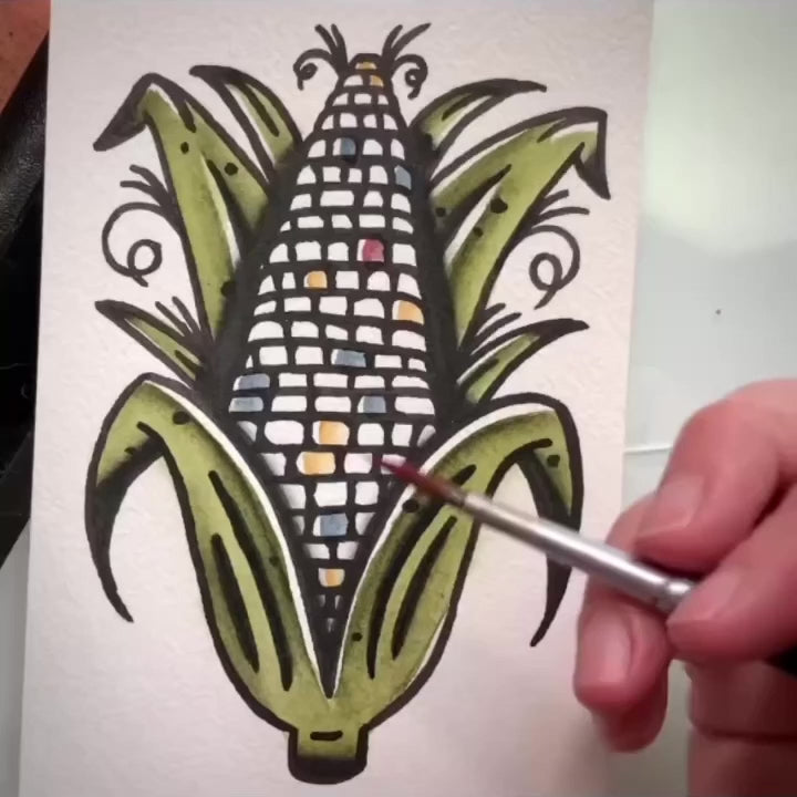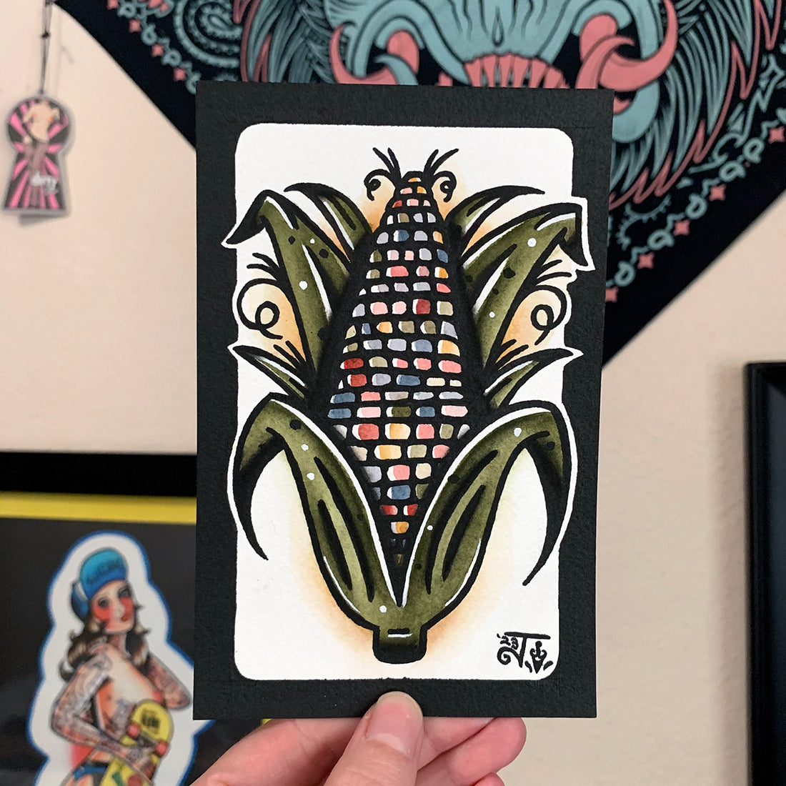 American traditional tattoo flash illustration Glass Gem Corn watercolor painting.