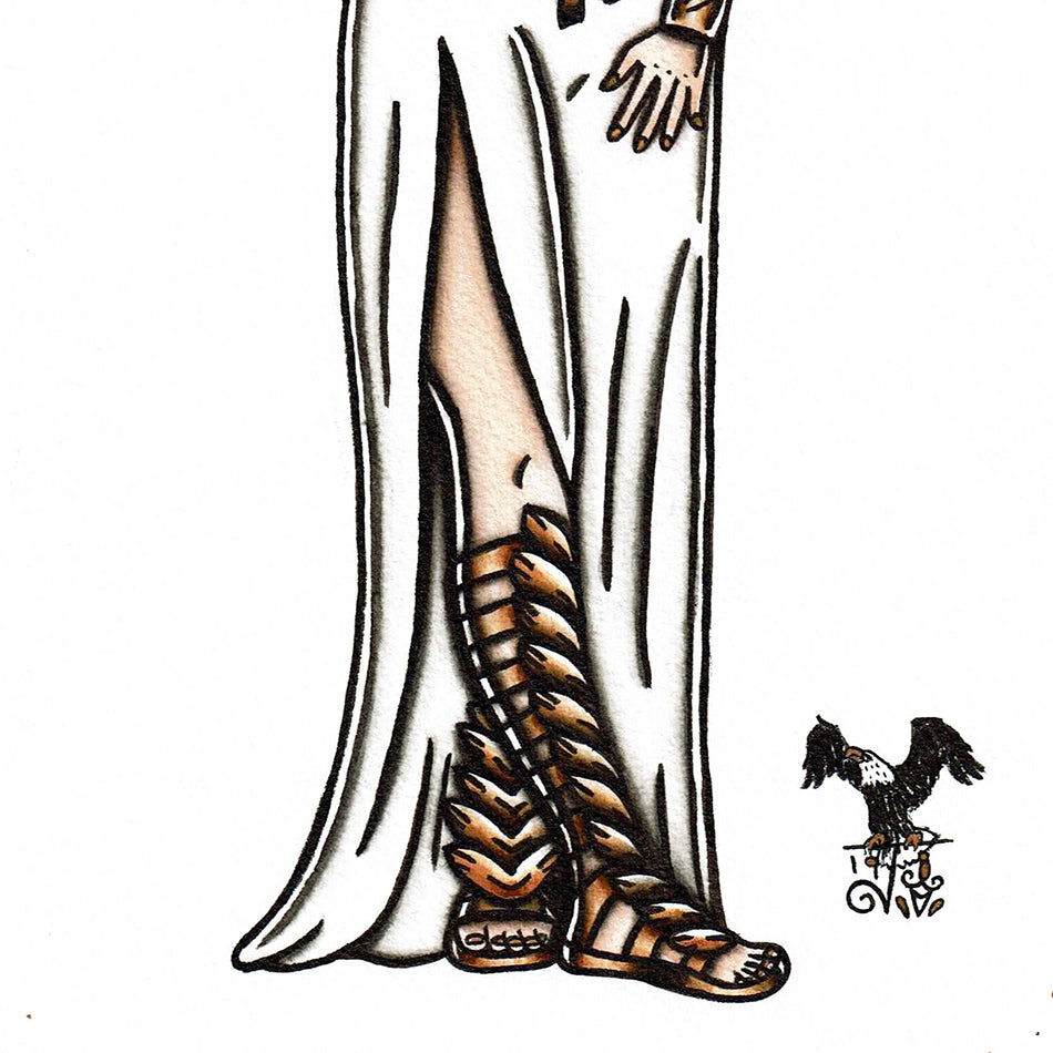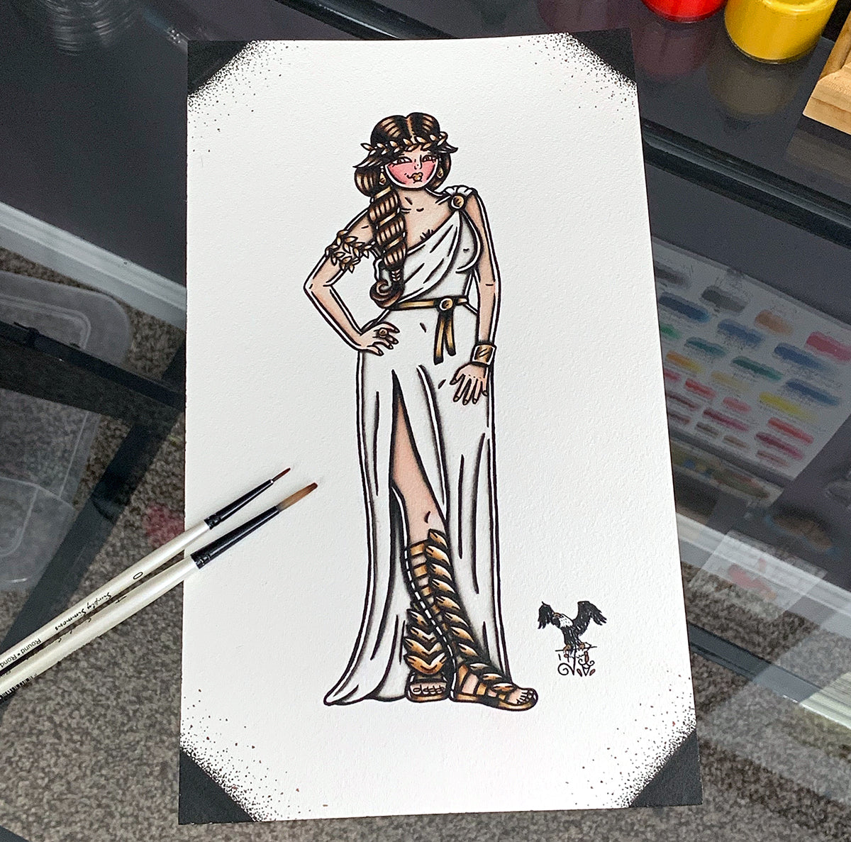 American Traditional tattoo flash Greek Goddess Pinup watercolor painting.