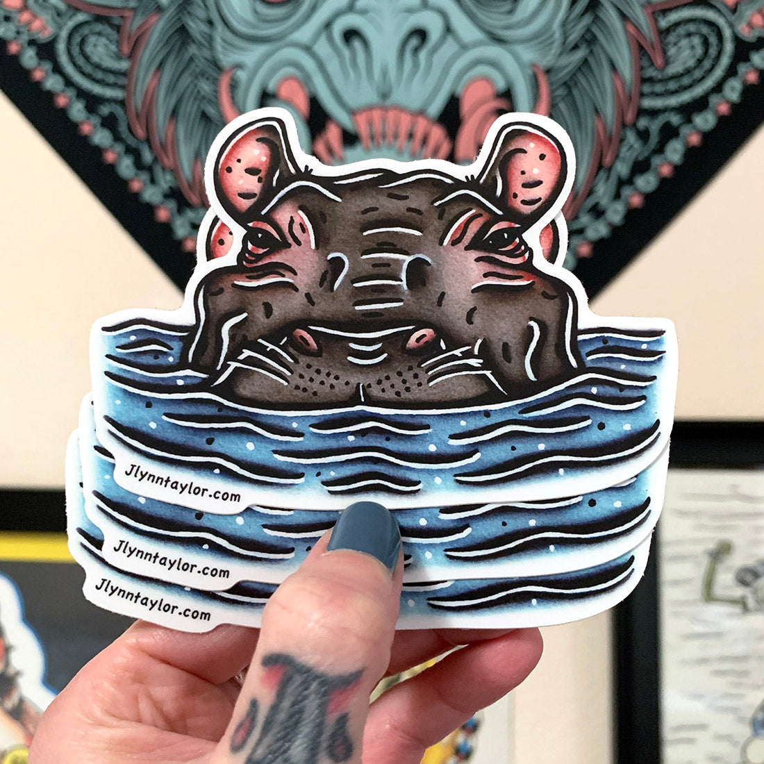 • Load image into Gallery viewer, American traditional tattoo flash wildlife illustration Hippopotamus watercolor sticker.