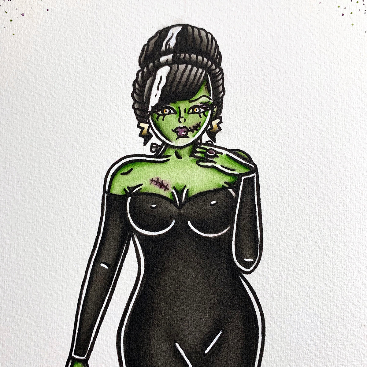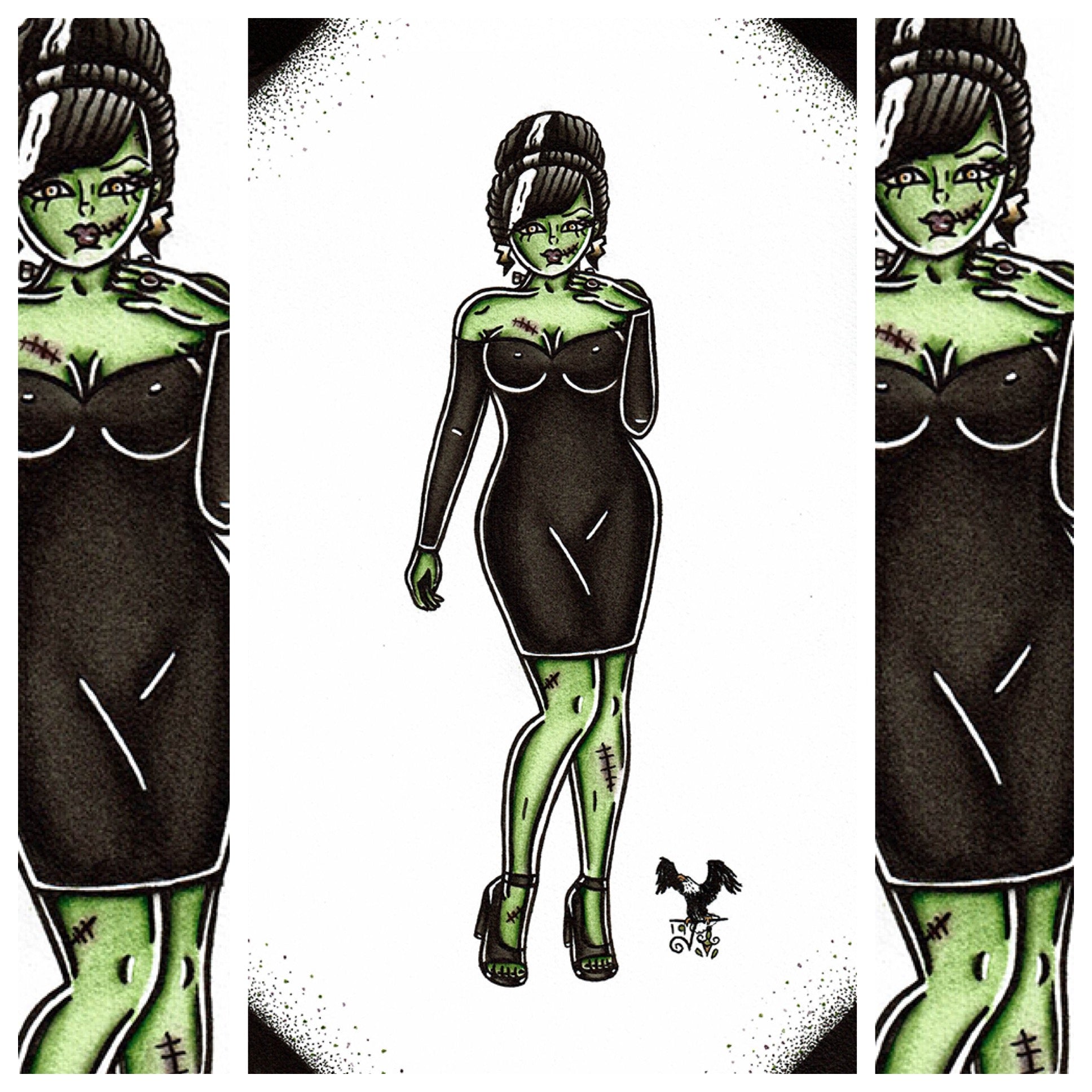 American Traditional tattoo flash Frankenstein Pinup watercolor painting.