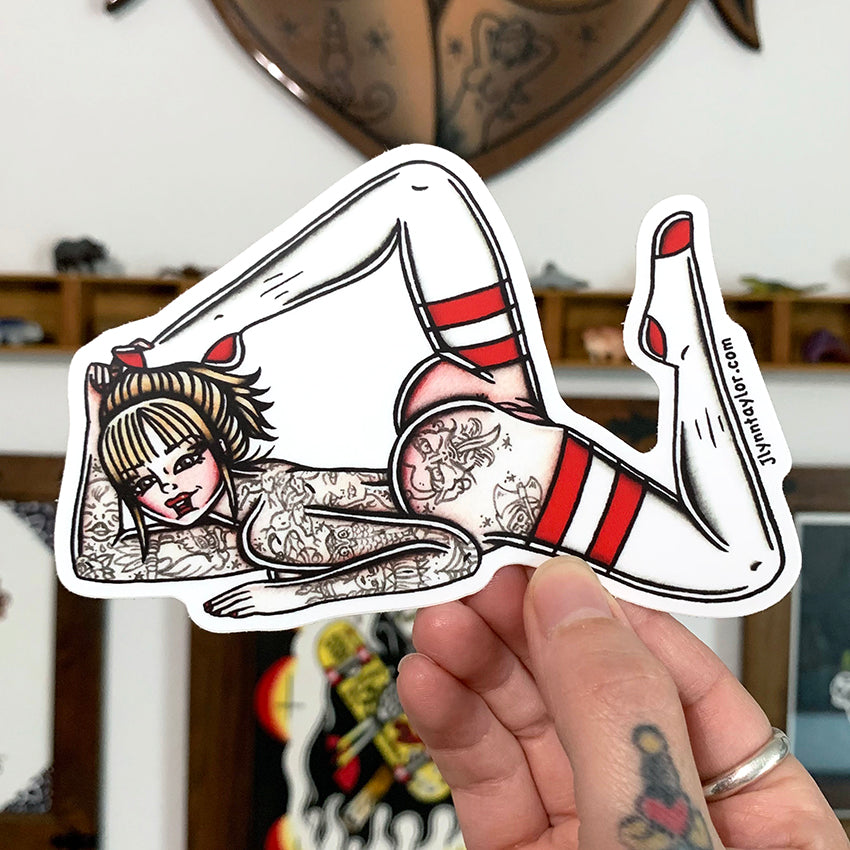 Professionally printed Naughty Red Socks Pinup die cut sticker on thick matte vinyl. Weather and scratch proof lasting up to 5 years outdoors. Approximately 4x5 inches. Original ink and watercolor artwork by Jlynntaylor.