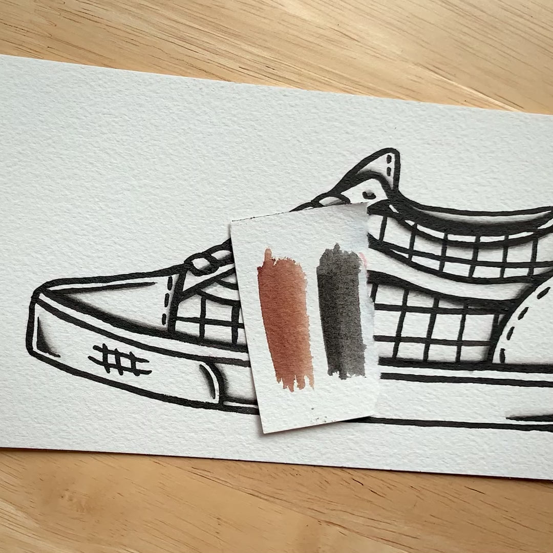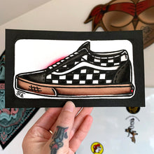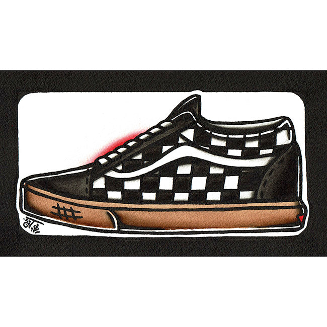American traditional tattoo flash Old Skool Checkered Skateboard Shoe watercolor painting.