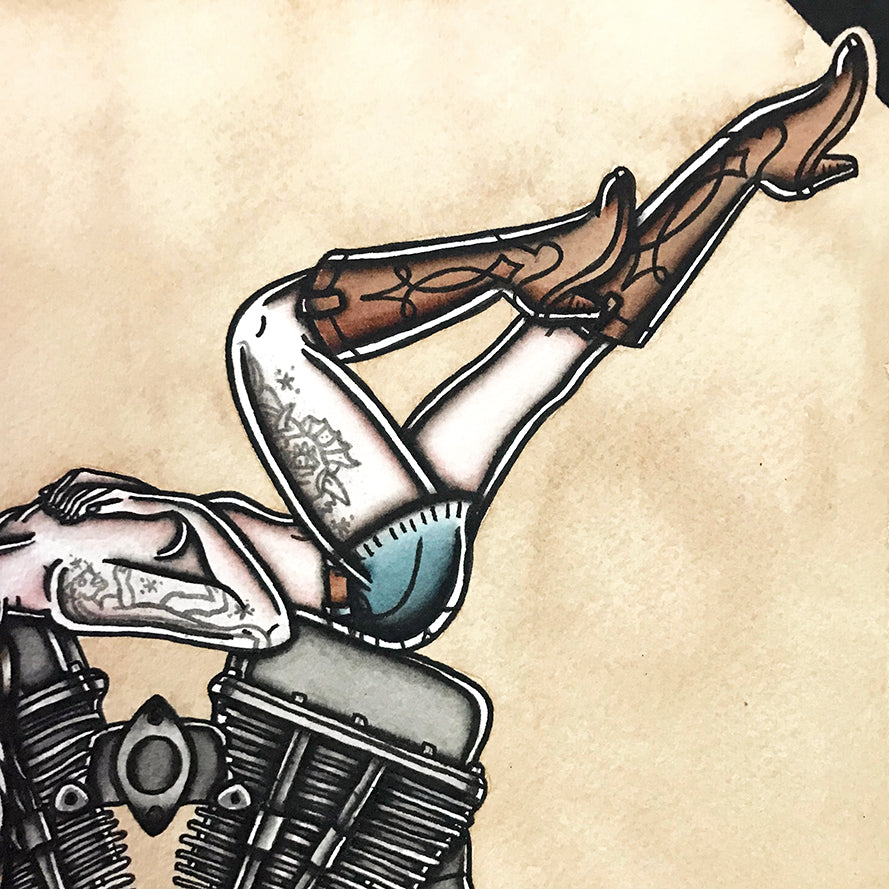 • Load image into Gallery viewer, American Traditional tattoo flash sexy Harley-Davidson Panhead engine pinup spitshade painting.