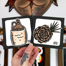 American traditional tattoo flash Whiskey Crock Jug and Pinecone Rosette watercolor paintings.