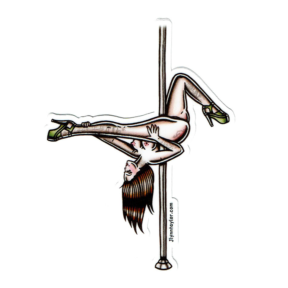 Professionally printed Pole Dancer Pinup die cut sticker on thick matte vinyl. Weather and scratch proof lasting up to 5 years outdoors. Approximately 3x4 inches. Original artwork by Jlynntaylor.