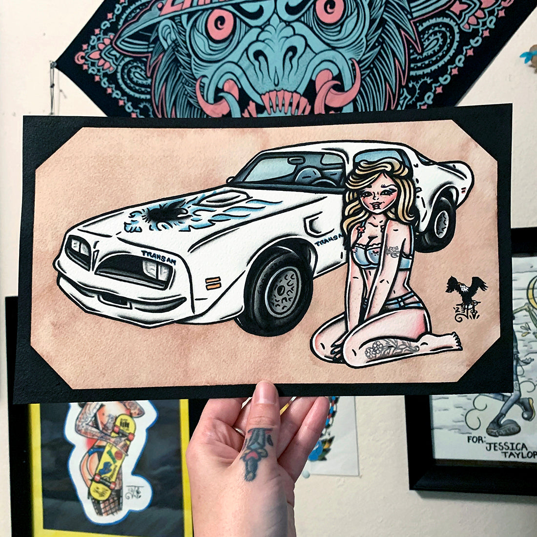 American traditional tattoo flash illustration Pontiac Firebird Trans Am watercolor Pinup Painting.