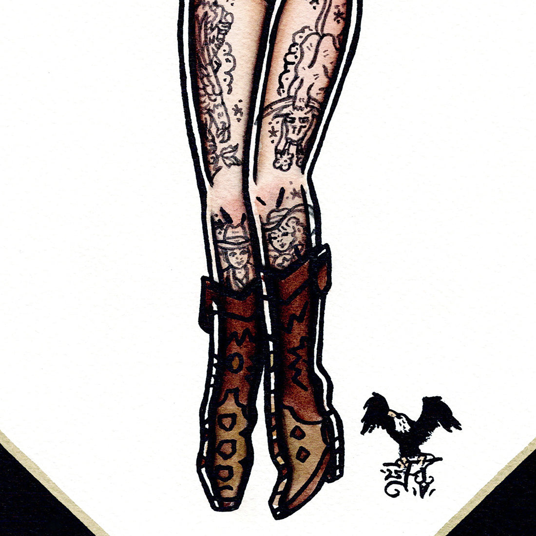 American traditional tattoo flash Rattlesnake Western Cowgirl Pinup Watercolor painting.