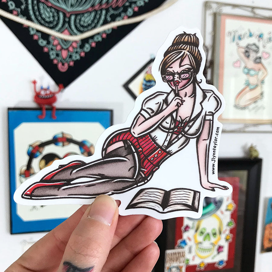 Librarian Pinup die cut sticker on thick vinyl. Weather and scratch proof lasting up to 5 years outdoors. Beautiful quality stickers printed by Rebel Reprints. Approximately 4x4 inches. Original artwork by Jlynntaylor.