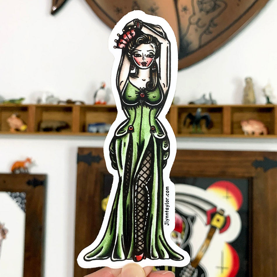 American Traditional tattoo flash Saloon Girl Pinup watercolor sticker.