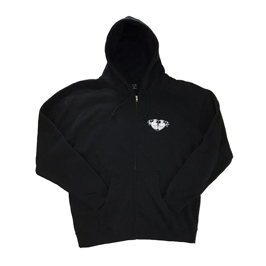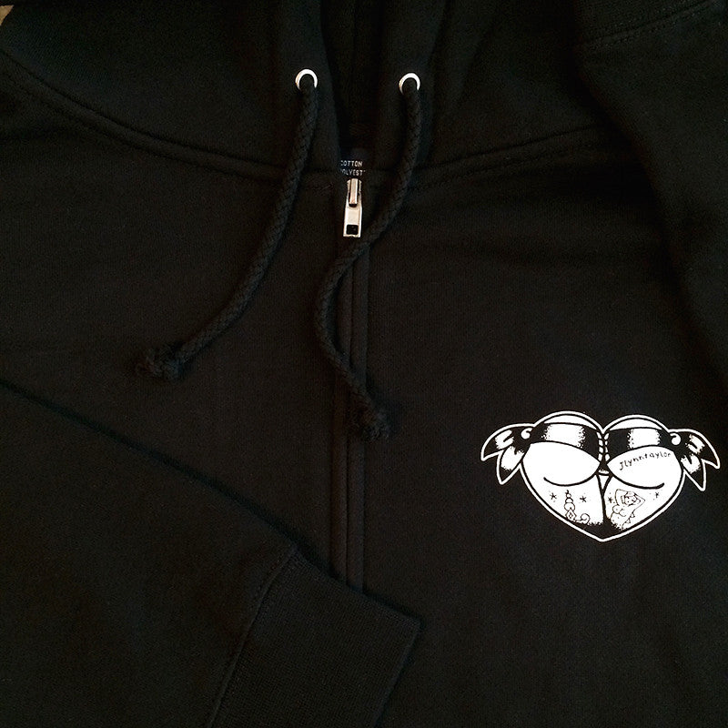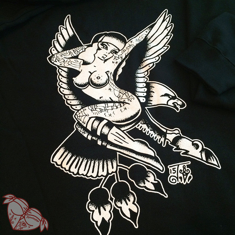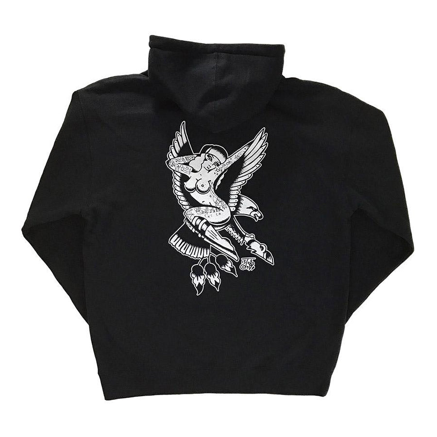 Mens heavyweight pullover hoodie featuring a white Scrunch Butt Heart logo print on front left and large white Eagle Pinup print on back.