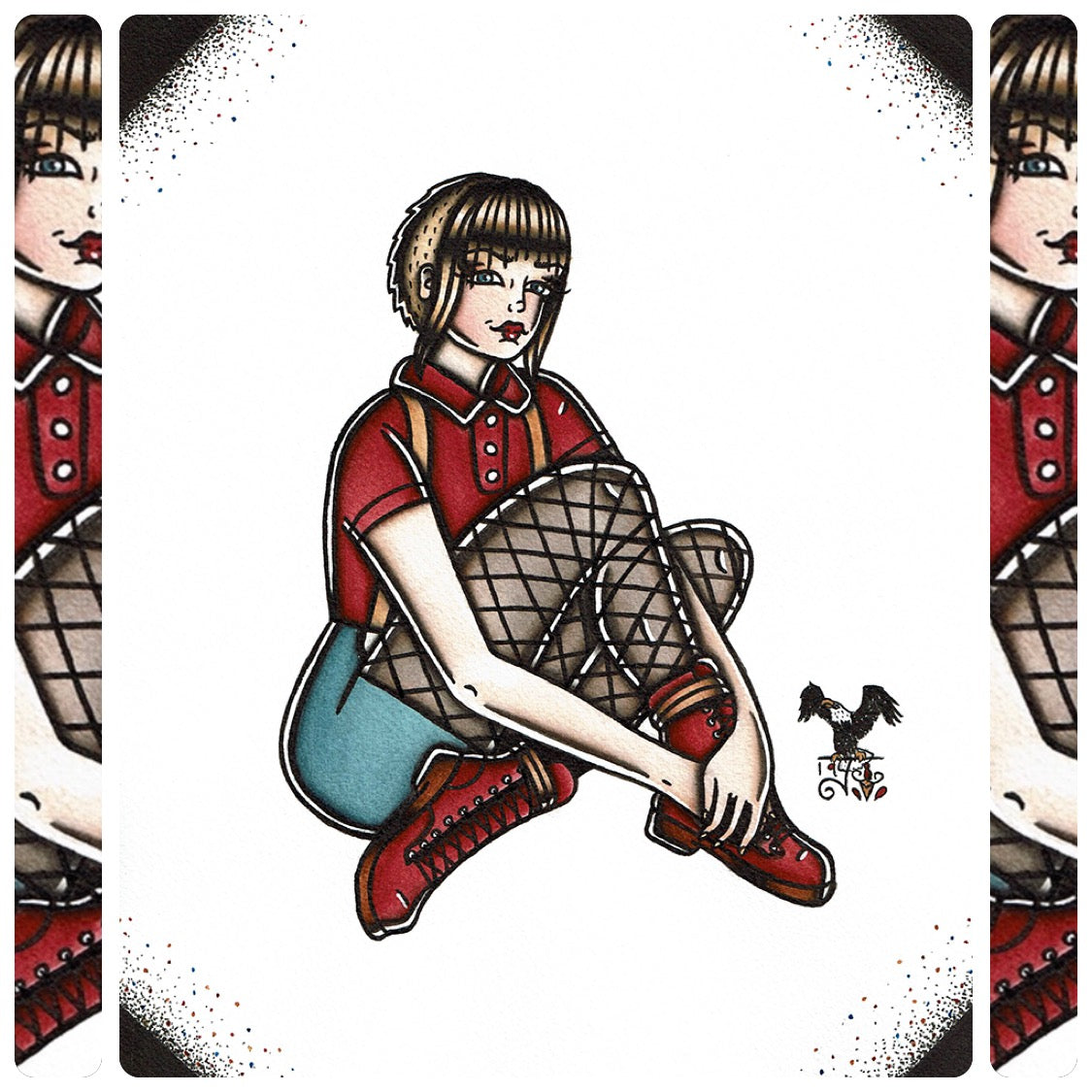American Traditional tattoo flash sexy traditional skinhead skinbyrd pinup spitshade painting.