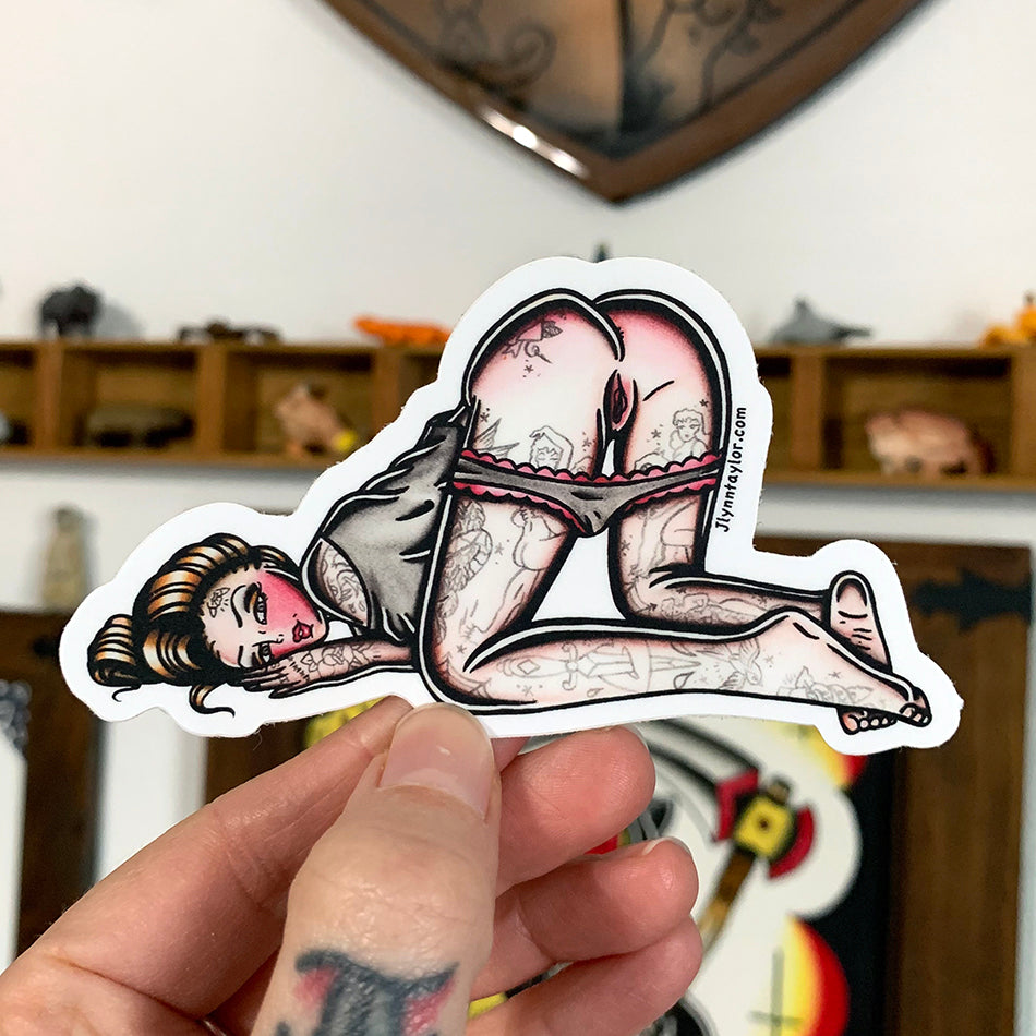 Sweet Dreams Pinup die cut sticker on thick matte vinyl. Weather and scratch proof lasting up to 5 years outdoors. Approximately 3x4 inches. Original artwork by Jlynntaylor.