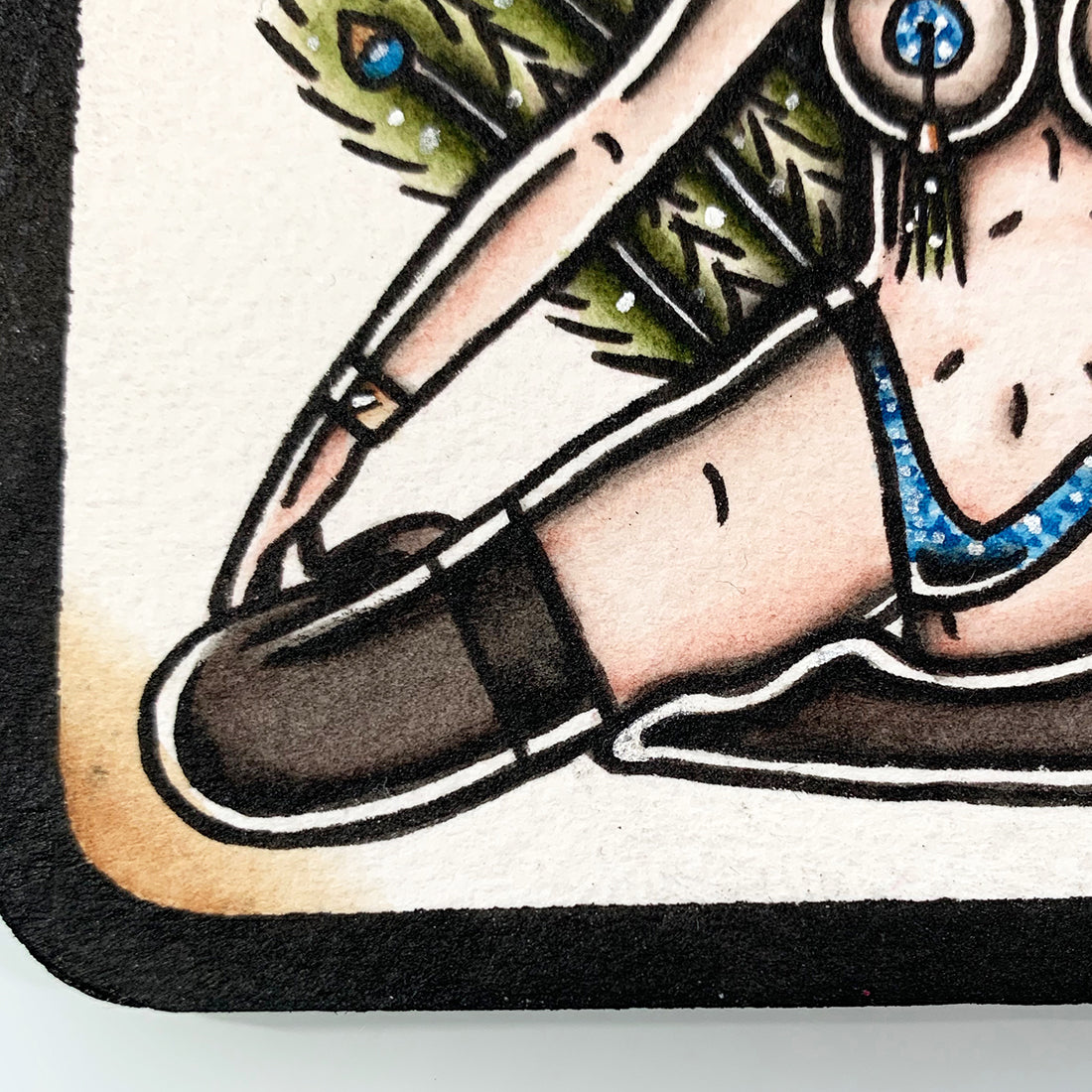 This was done for an art show and glued to a paper coaster. Small 4x4" hand painted ink and watercolor painting on Arches 140 cold press by artist Jlynntaylor. Painting has been sprayed with a UV resistant matte clear coating. Merchandise has been made from this design.