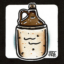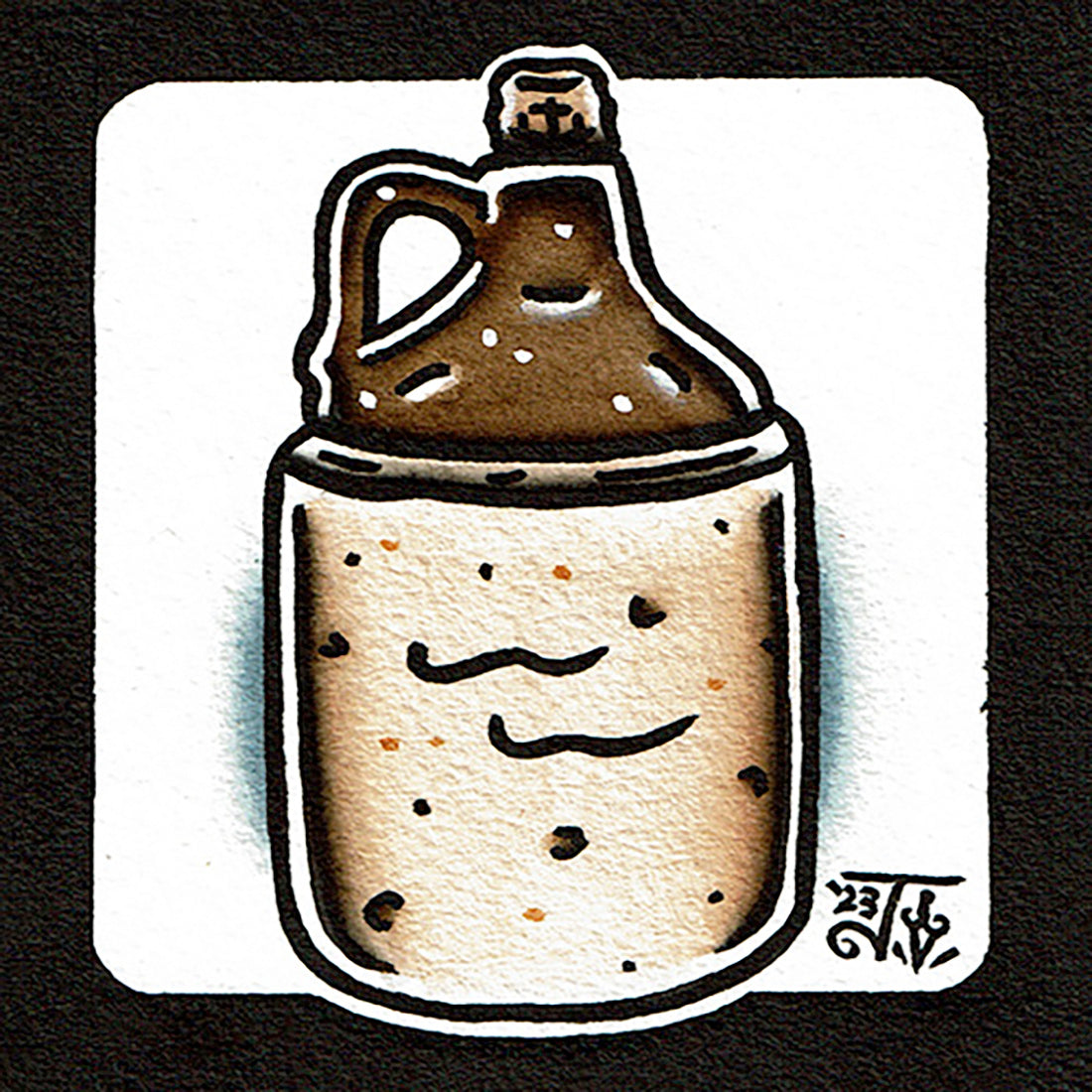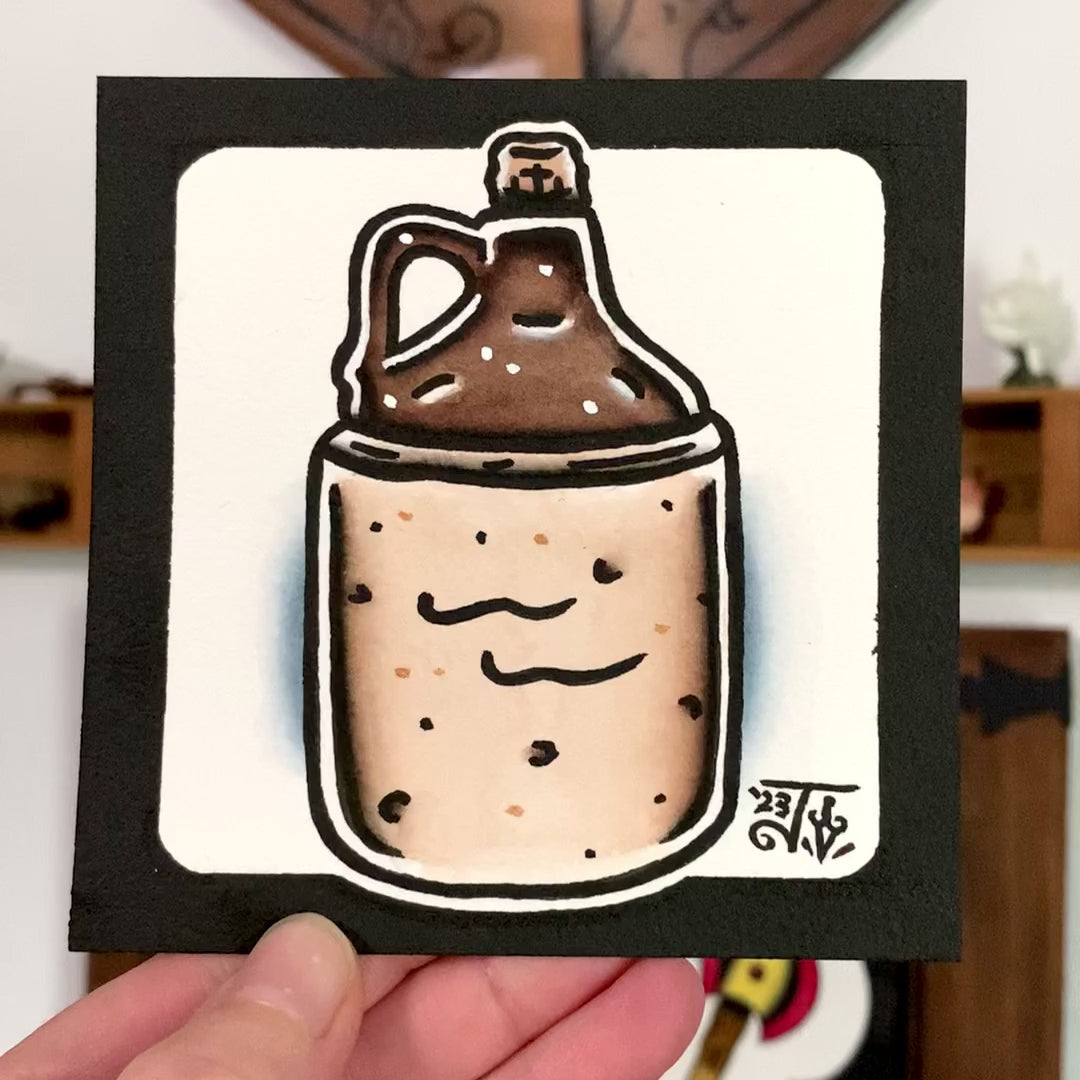 American traditional tattoo flash Whiskey Crock Jug watercolor painting.